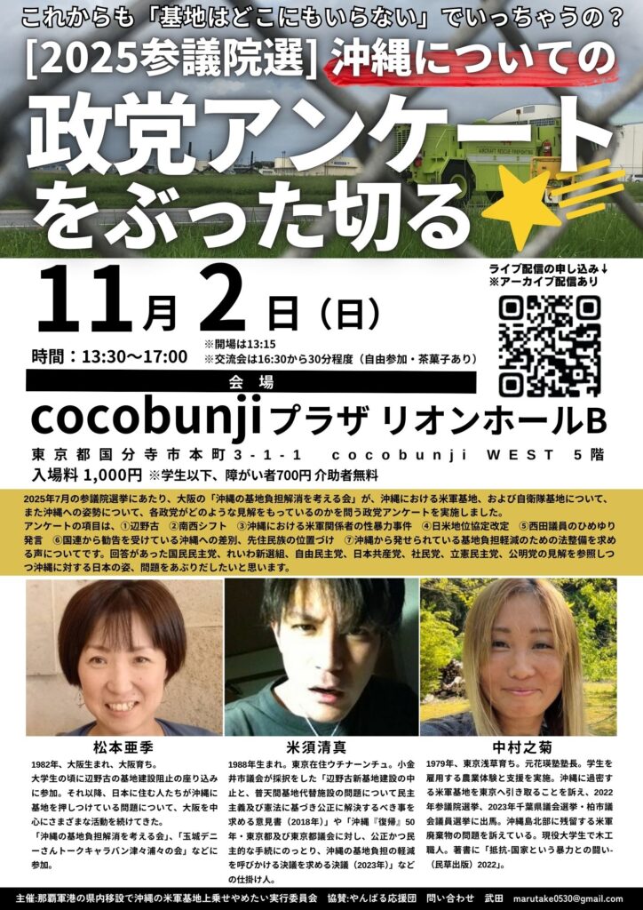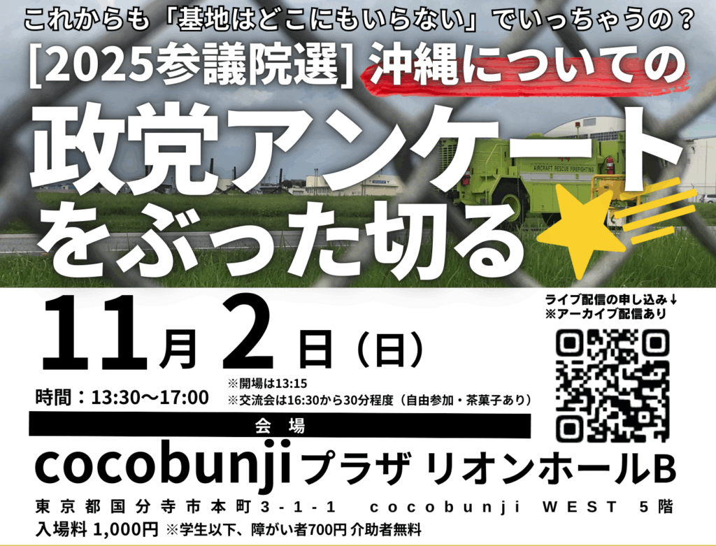 11月2日(日)13:30から【これからも「基地はどこにもいらない」でいっちゃうの? [2025参議院選] 沖縄についての政党アンケートをぶった切るトークイベント(オフライン・オンライン)】の開催を致します。